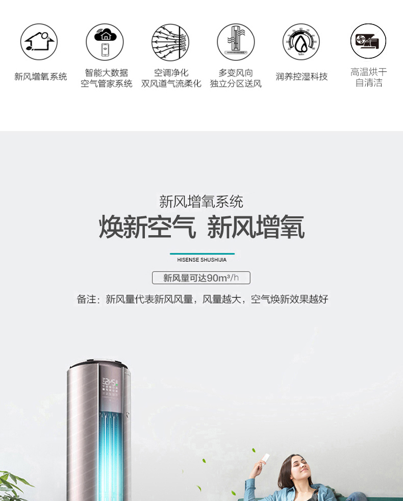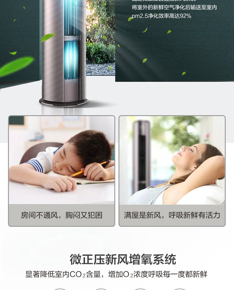 | 其他特點(diǎn) | 新風(fēng)增氧系統(tǒng),智能大數(shù)據(jù)空氣管家系統(tǒng),空調(diào)凈化雙風(fēng)道氣流柔化,三段式出風(fēng)設(shè)計(jì) |