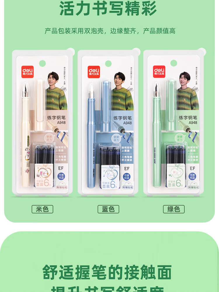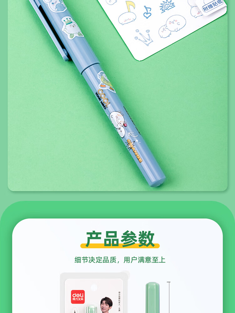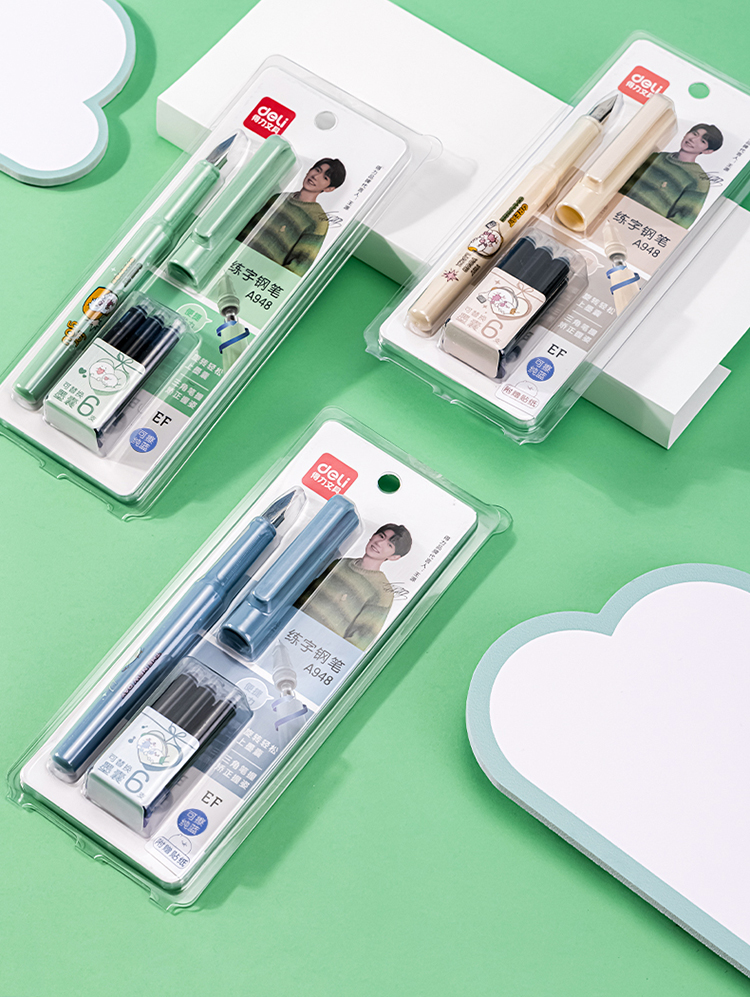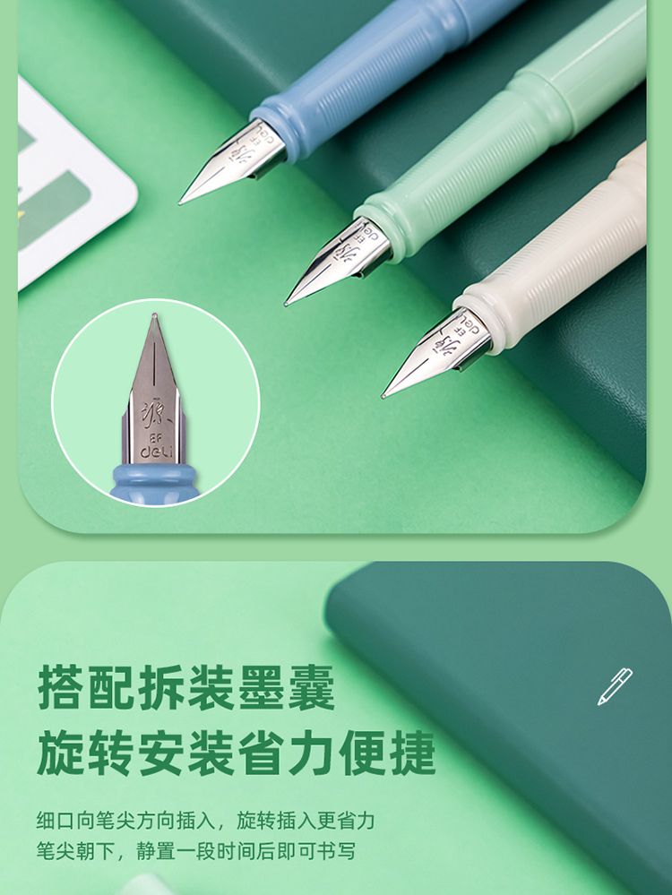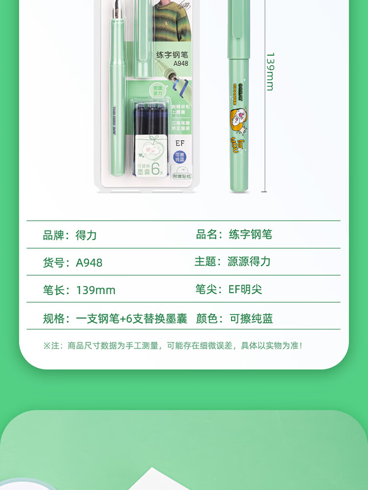 得力(deli)源源得力練字鋼筆 EF明尖 學(xué)生墨水筆 附貼紙 可擦純藍墨囊 1筆+6墨囊+貼紙 A948純藍 自營
